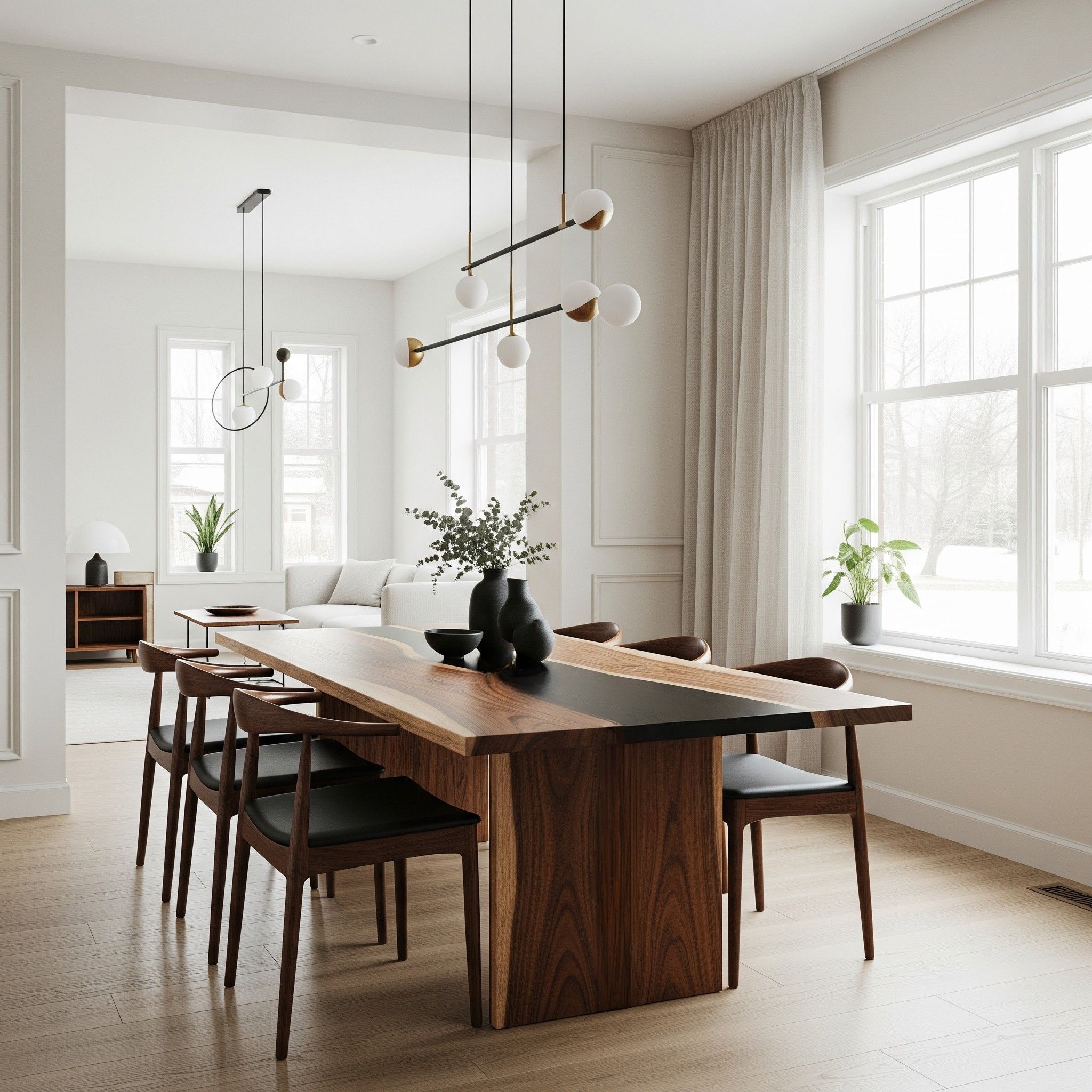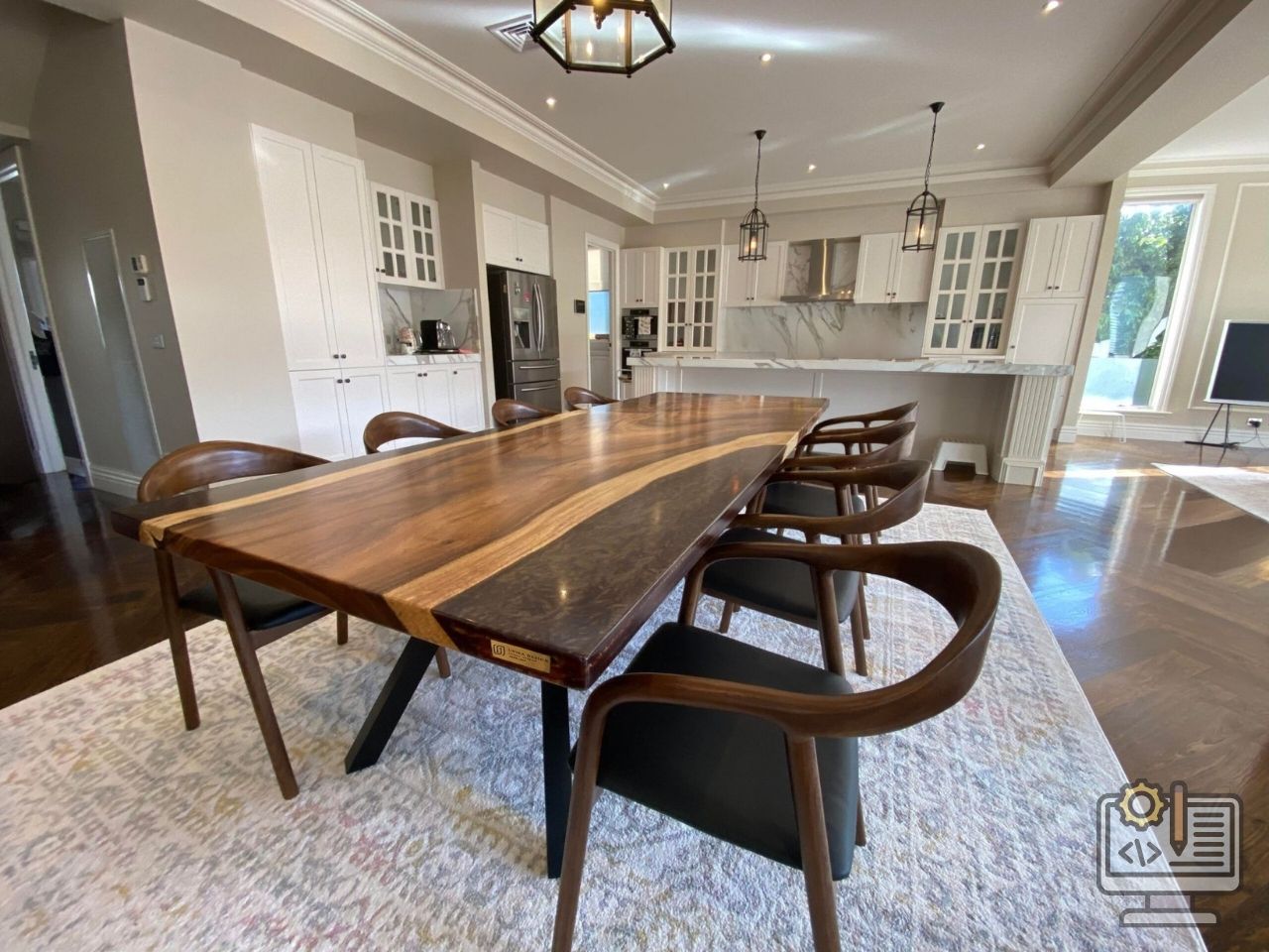 Vi bruger Østindisk valnød (Albizia Saman) fra Sydamerika eller Cambodia, kendt for sine markante åretegninger, gyldne kanter og smukke kontraster. Epoxyen er en kvalitets-epoxy fra Tyskland, udviklet til møbelproduktion. Læs mere om vores træ her.
