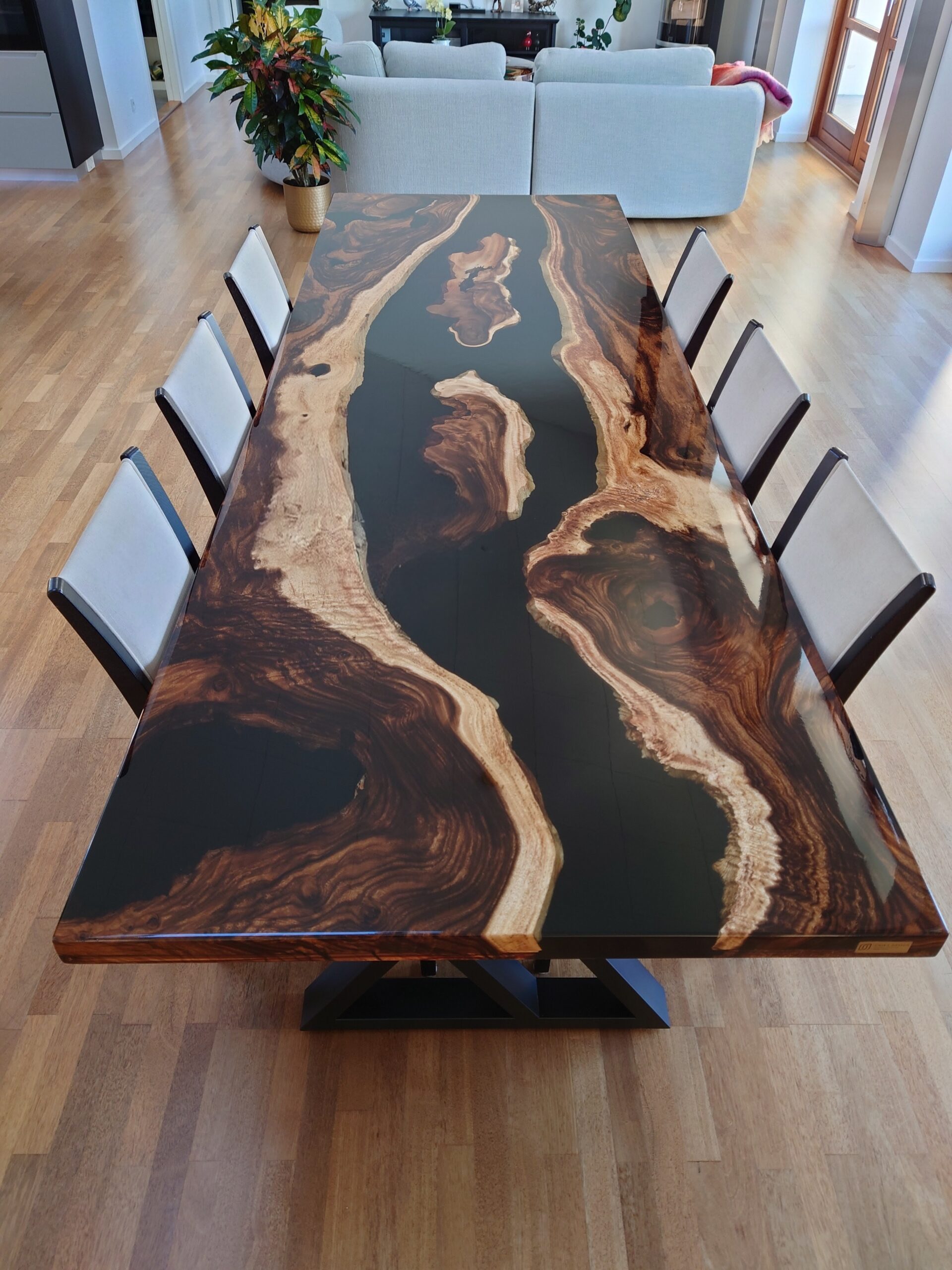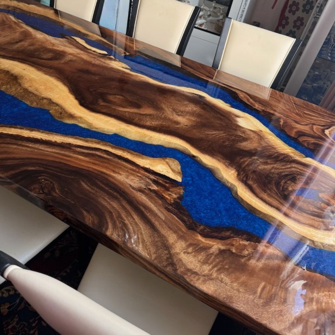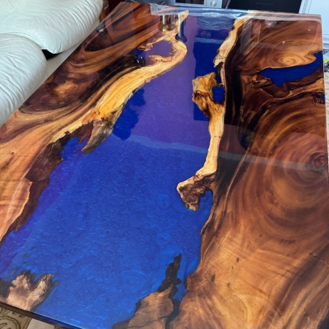 Vores unikke 3D-effekt fremhæver træets naturlige skønhed uden at være helt transparent. Epoxy bordet kombinerer en solid 2D-bund med en glasklar epoxy, hvilket skaber en forbløffende 3D-effekt. De gyldne kanter på den østindiske valnød bliver tydeligt fremhævet og giver et utroligt detaljeret udtryk.